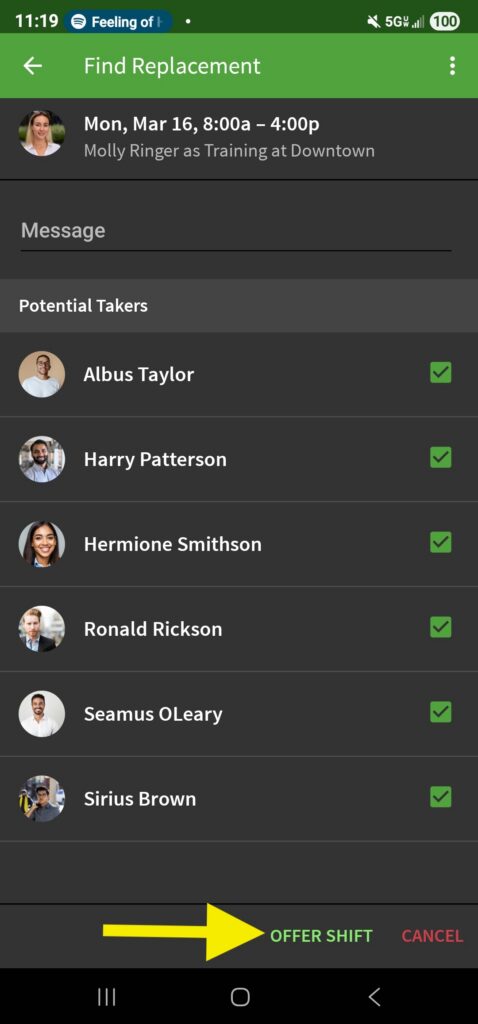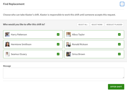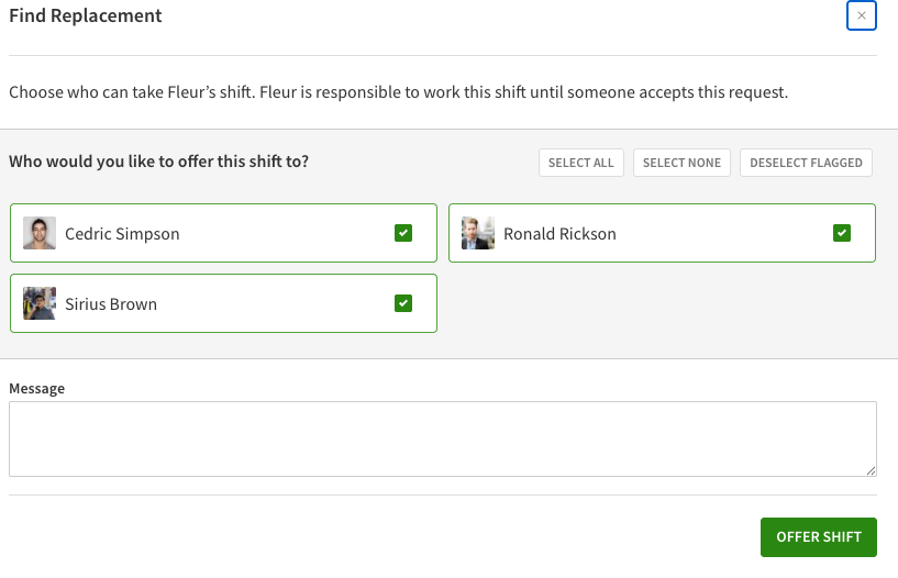 - Select the users you’d like to be able to pick the shift up, then click Offer Shift.