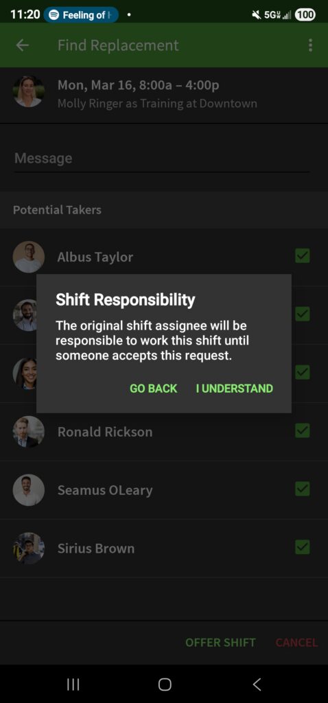 If your users can’t make it to their shift, you can find a replacement to quickly find another user who can work the shift. The first user to accept the shift will be automatically assigned the shift to their schedule.