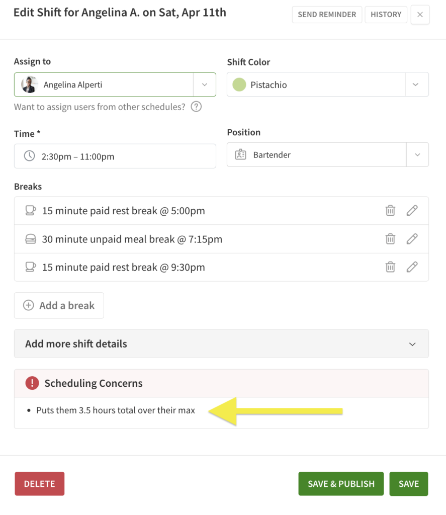 When scheduling or reassigning a shift, Max Hours alerts will appear as scheduling concerns similar to how Overtime alerts appear.