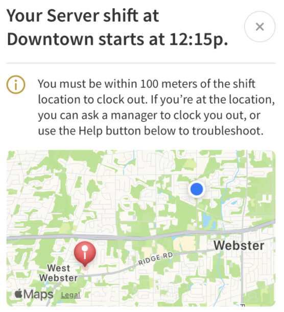 This indicates the user is not within the range of the location and can not clock in/out for their shift. The red pin on the map represents the schedule or job site location. The blue dot represents the user’s current location. If the schedule or job site address pin looks like it’s in the right spot on the map, the user might be in the wrong place.