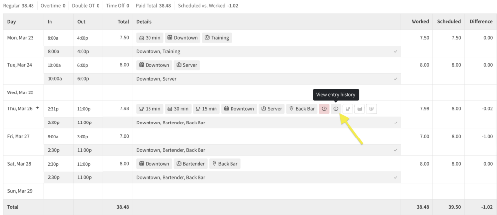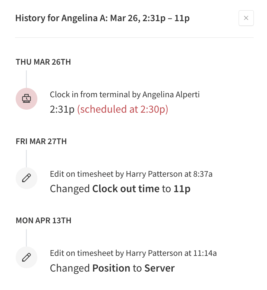View the history of a particular timesheet entry to see when the entry was created, how it was created, any edits made to the entry, and who made the changes. You can also view the map where users clocked in and clocked out when location restrictions are enabled.