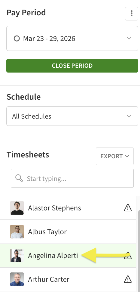 - Click the user’s name under Timesheets on the left. The user’s timesheet appears.